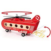Theres no cooler way to fly than by helicopter. Behind the pilot in the new Cargo Transport Helicopter toy, the cargo bay is ready to carry some serious weight even two fully loaded wagons. With everything in place, spin the rotor of your BRIO helicopter, take off and soar high above your BRIO World.
