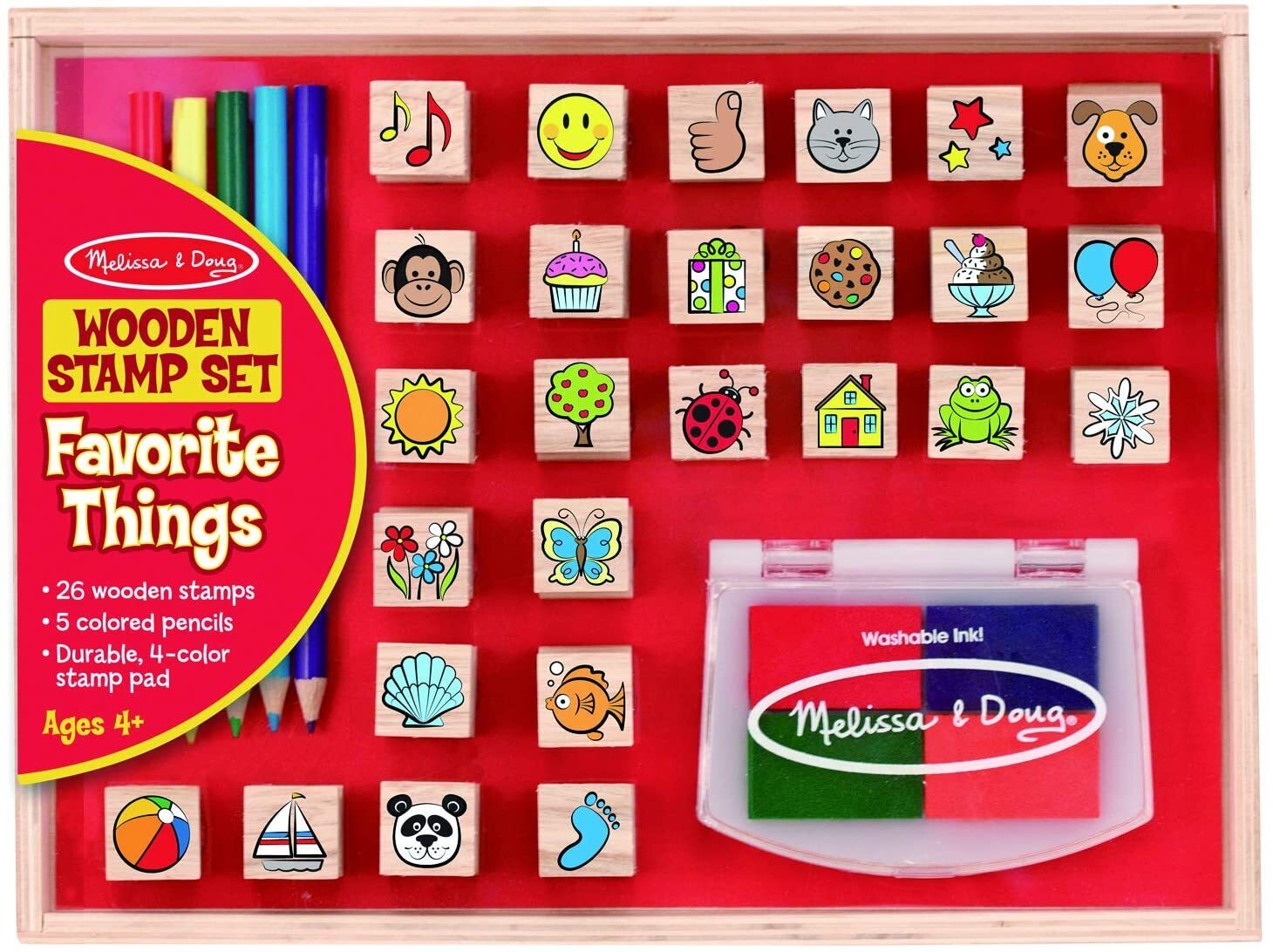 This set of 26 wooden stamps features all sorts of favourite things, from pets and wild animals to sweets and party treats! Also included are five coloured pencils, a four-colour stamp pad with washable ink, and a sturdy wooden box for storage. Great for making cards, scenes, and exciting storylines!