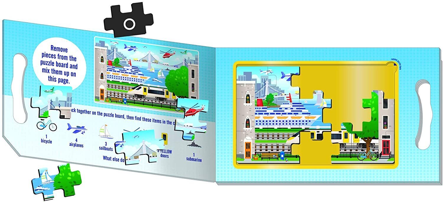 Its never been easier to have puzzle fun anywhere, anytime! This portable play set includes two 15-piece magnetic puzzles with exciting vehicle scenes in a compact, fold-out format and a built-in carrying handle! Pieces are shape-coded on the back for easy sorting, and cling to the inside surfaces to minimize mess, making this a terrific travel activity for kids three and older. The set includes seek-and-find activities as an extra challenge once the puzzles are completed! Puzzle play is a great way to encourage logical thinking, goal setting, and patience.