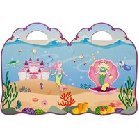 Imagine a glittery mermaid grotto--then bring it to life with this enchanting sticker set! A double-sided, glossy background board offers lots of space to layer and arrange the 65 reusable puffy stickers: A seashell closet has room for 10 glittering outfits; a trio of dress-up mermaids is ready for a makeover in the pretty purple dressing room; and a panoramic sandy seafloor sets the stage for unlimited undersea fun. Just add the shimmering puffy stickers to fill in the backgrounds, dress the mermaids, and create an original scene! The 65 stickers are easy to place, layer, and rearrange, so the storytelling possibilities are endless. And the gorgeous dress-up stickers mix, match, and layer in any combination, and fit all five of the dress-up mermaids. When playtime is over, simply fold up the sturdy background board store it all away--then just grab the diecut handle and take this fantastical sticker set to go.