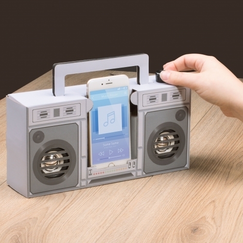 Get a blast from the past every time you listen to your favourite tracks on your modern smart device. Slot your Smartphone into this retro-looking mini Boombox and enjoy amplified sound. It may look retro but at the same time is both wireless and lightweight. The best of the past and the present. Made from cardboard.