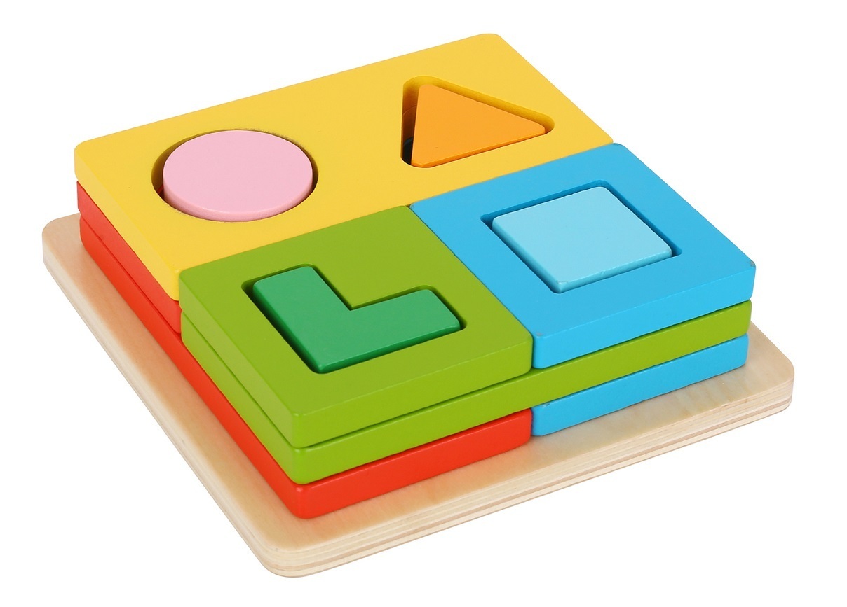 Each wooden tile has a shape cut out in the middle. Sort and stack them into 4 piles. A great way to learn colours and it encourages shape recognition. The brightly colour tiles are painted with nontoxic paint.