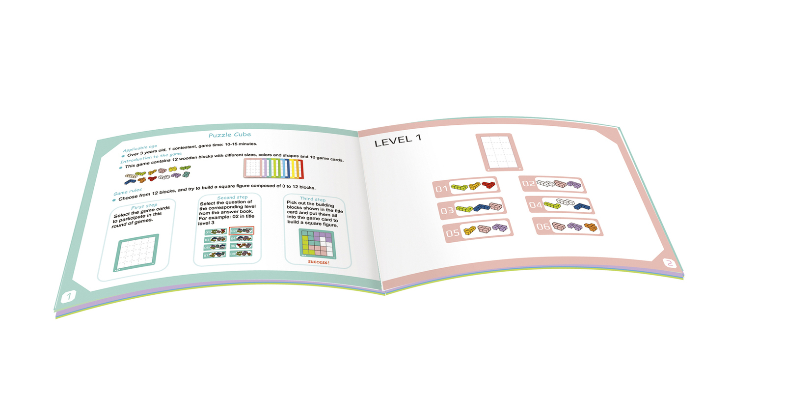 A challenging game where kids are required to place the colour blocks on the pre-printed cards. There are 12 blocks of various colour, each block consists of 5 wooden cubes of different shapes.