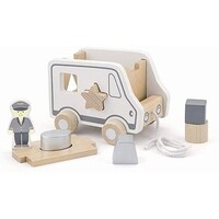 Wooden pull-along shape sorting truck. Toddlers can drop wooden shapes (triangle, ellipse, star, square, trapezoid, cylinder) through the matched holes, then open the lid and take them all out to start again. This early-learning truck encourages shape recognition and manual dexterity. More than a shape store, the truck is alos a pull-along toy allowing toddlers to play with it individually.